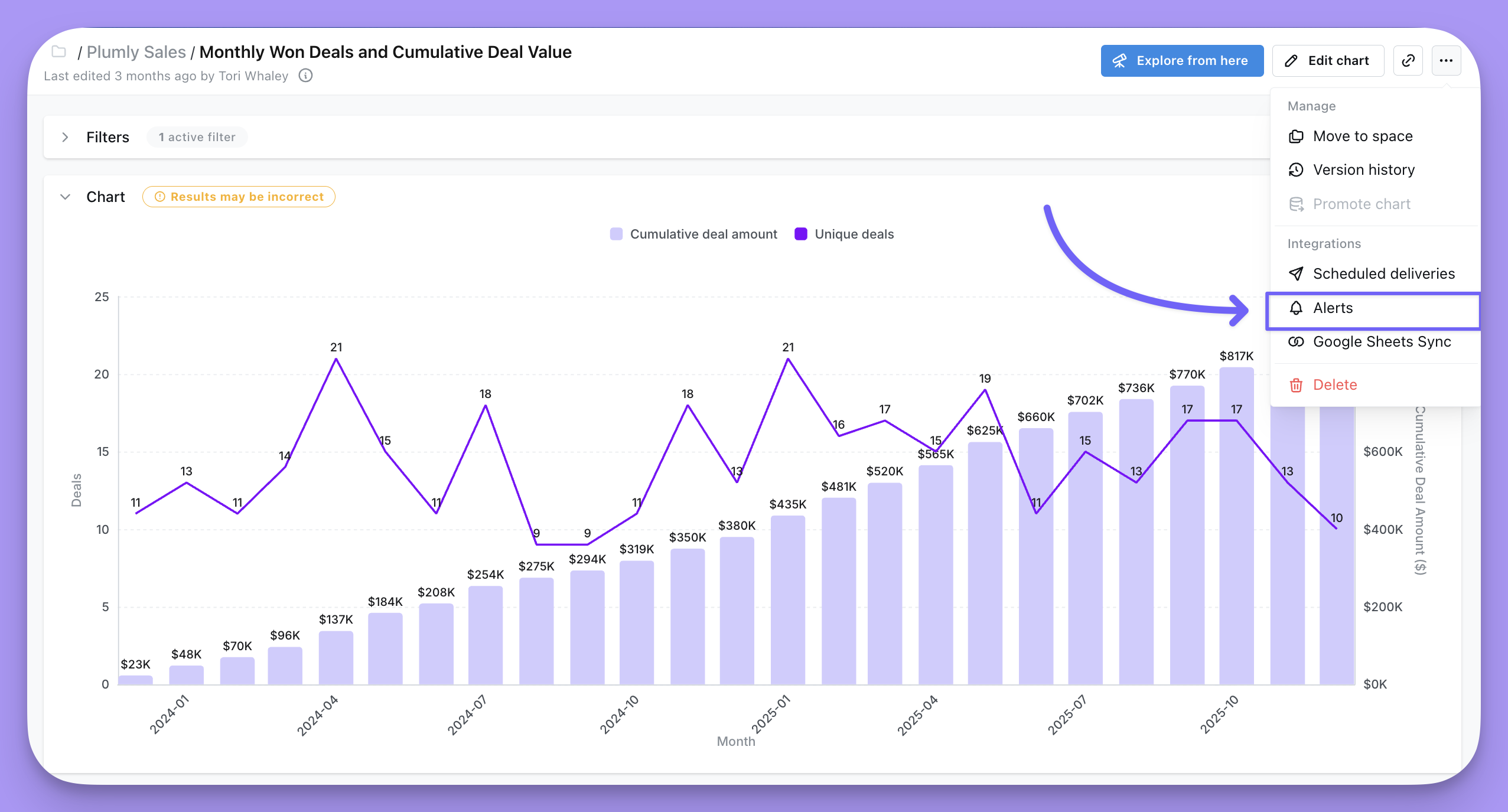 Only users with admin, developer or edit access can create alerts. To create an alert, click on the three-dot menu in the top-right corner of your chart, then click onAlerts.