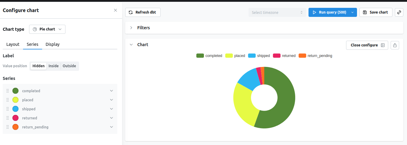 You can predefine colors for your string type dimensions, these colors will be used instead of your default organization colors for the right value when you use a grouped bar chart or a pie chart.- dbt v1.9 and earlier