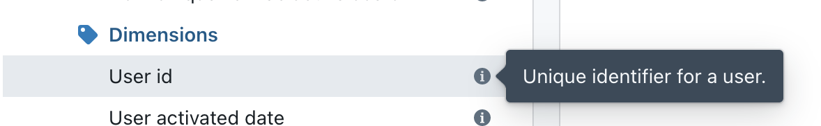 Column descriptions in your YAML file are automatically pulled into Lightdash and you can spot them if you hover over the dimension name.