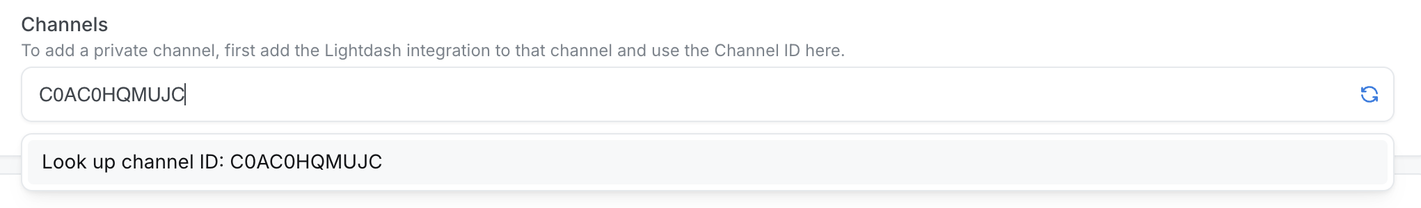 In Lightdash, paste the channel ID into the Channels input field and select the “Look up channel ID” option to find your private channel.