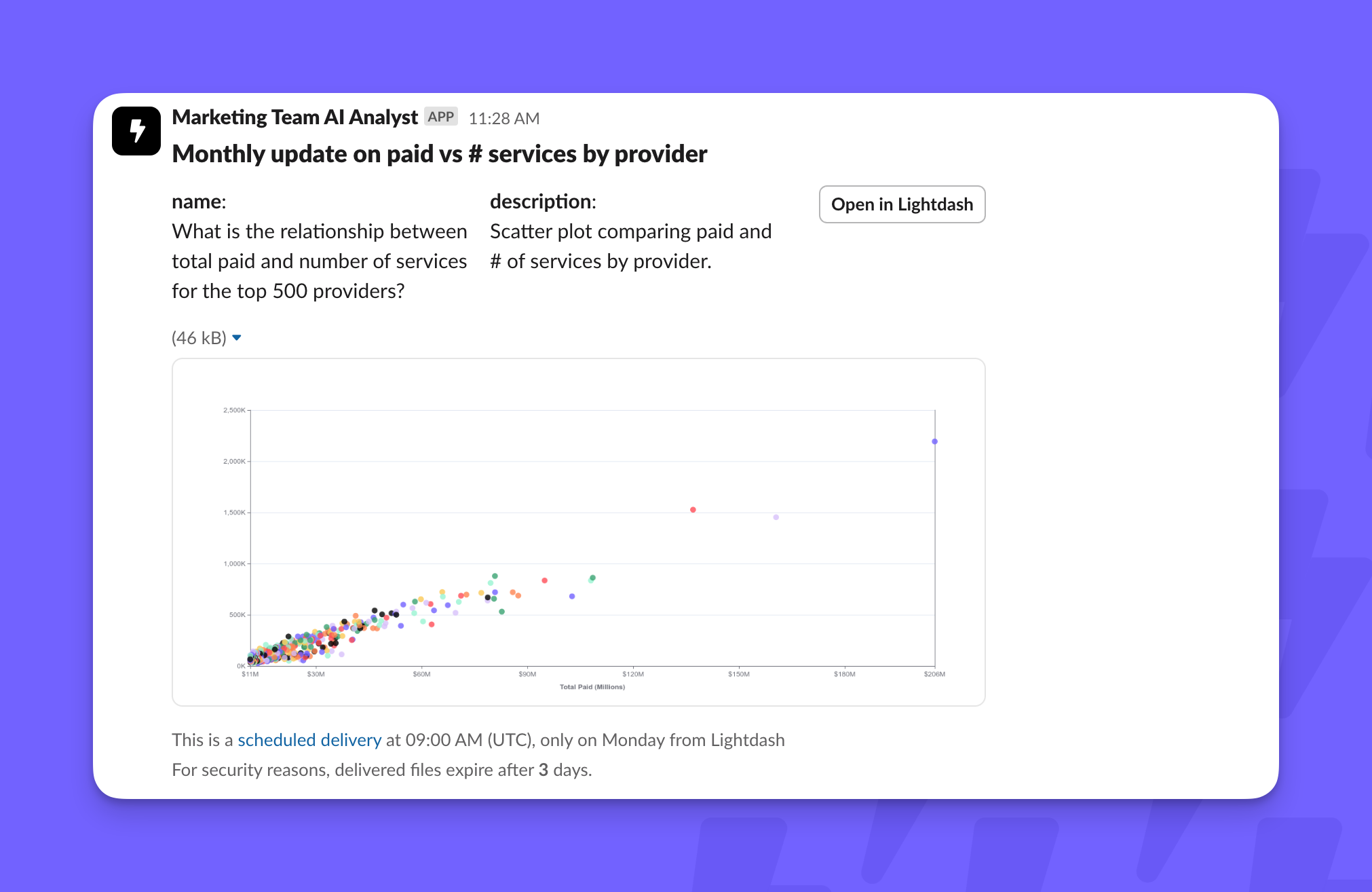 Once Slack is added to your Lightdash organization you can use it as a destination for scheduled deliveries. You can schedule refreshes for either Charts or Dashboards and push the results into a Slack channel or DM. The result will look like this for charts if you choose to attach an image of the chart: